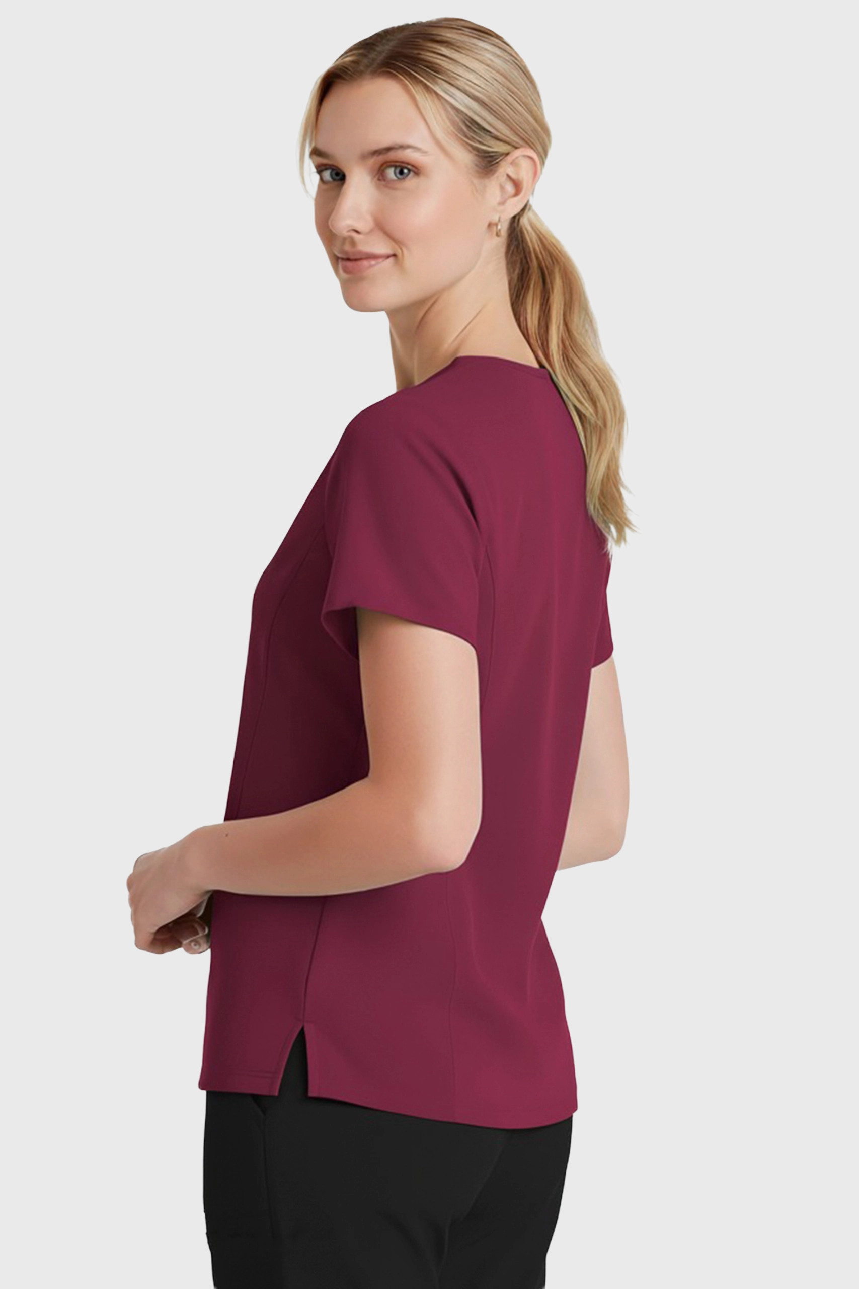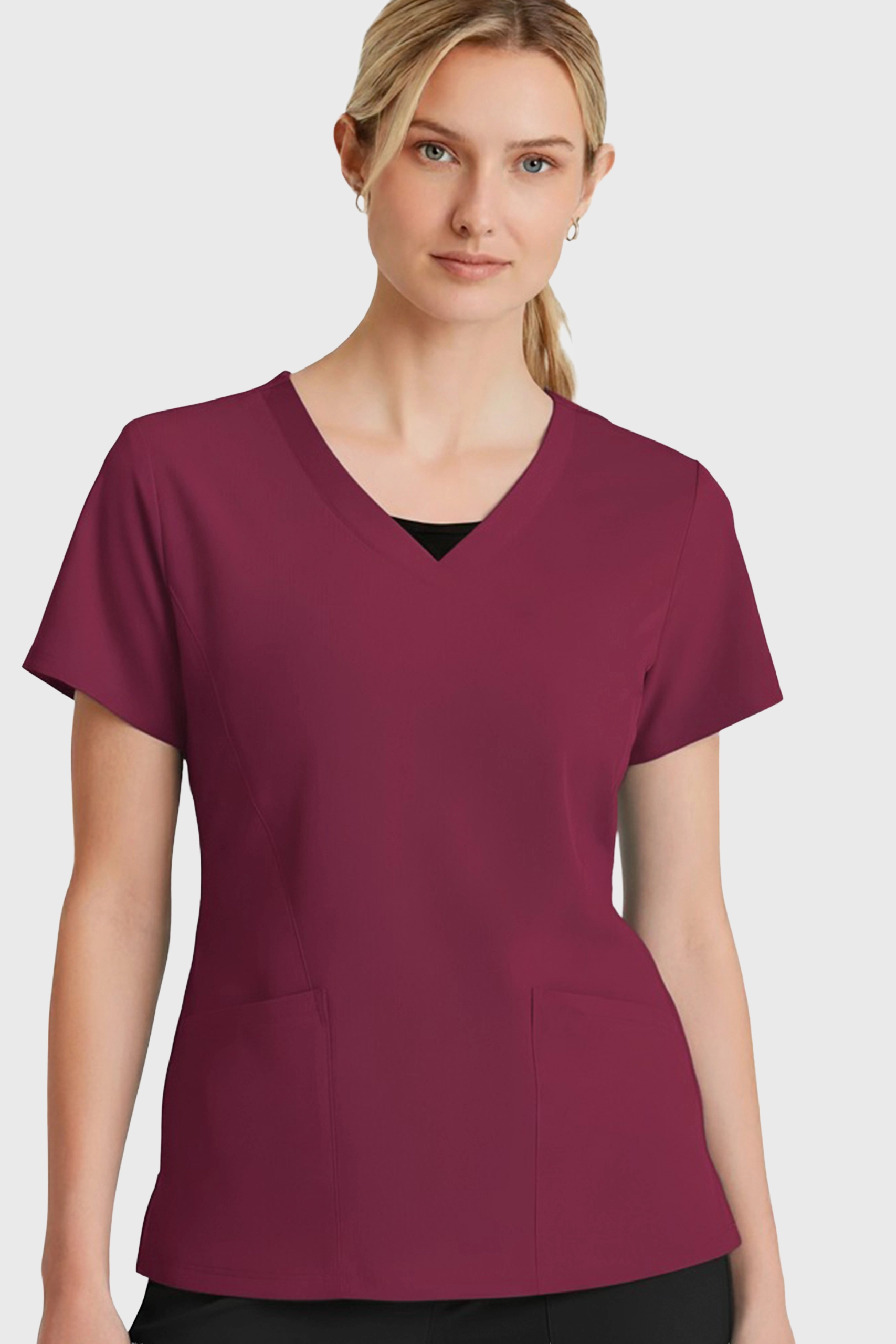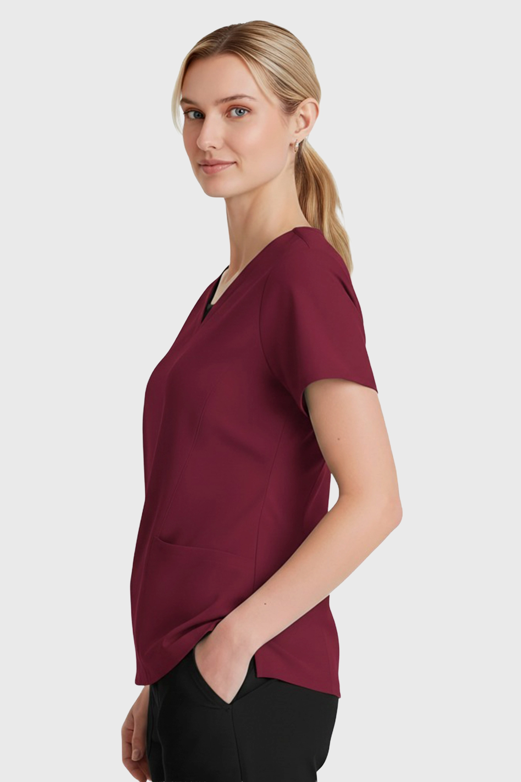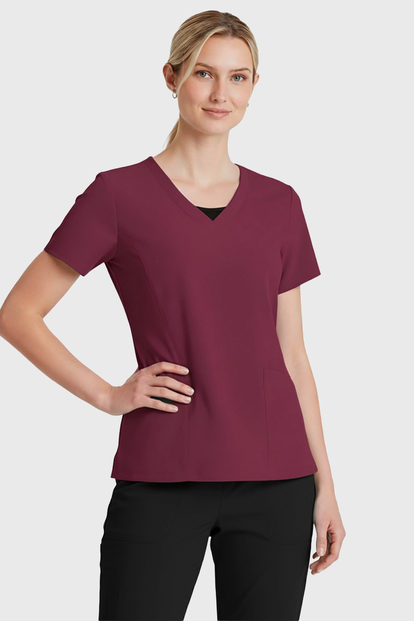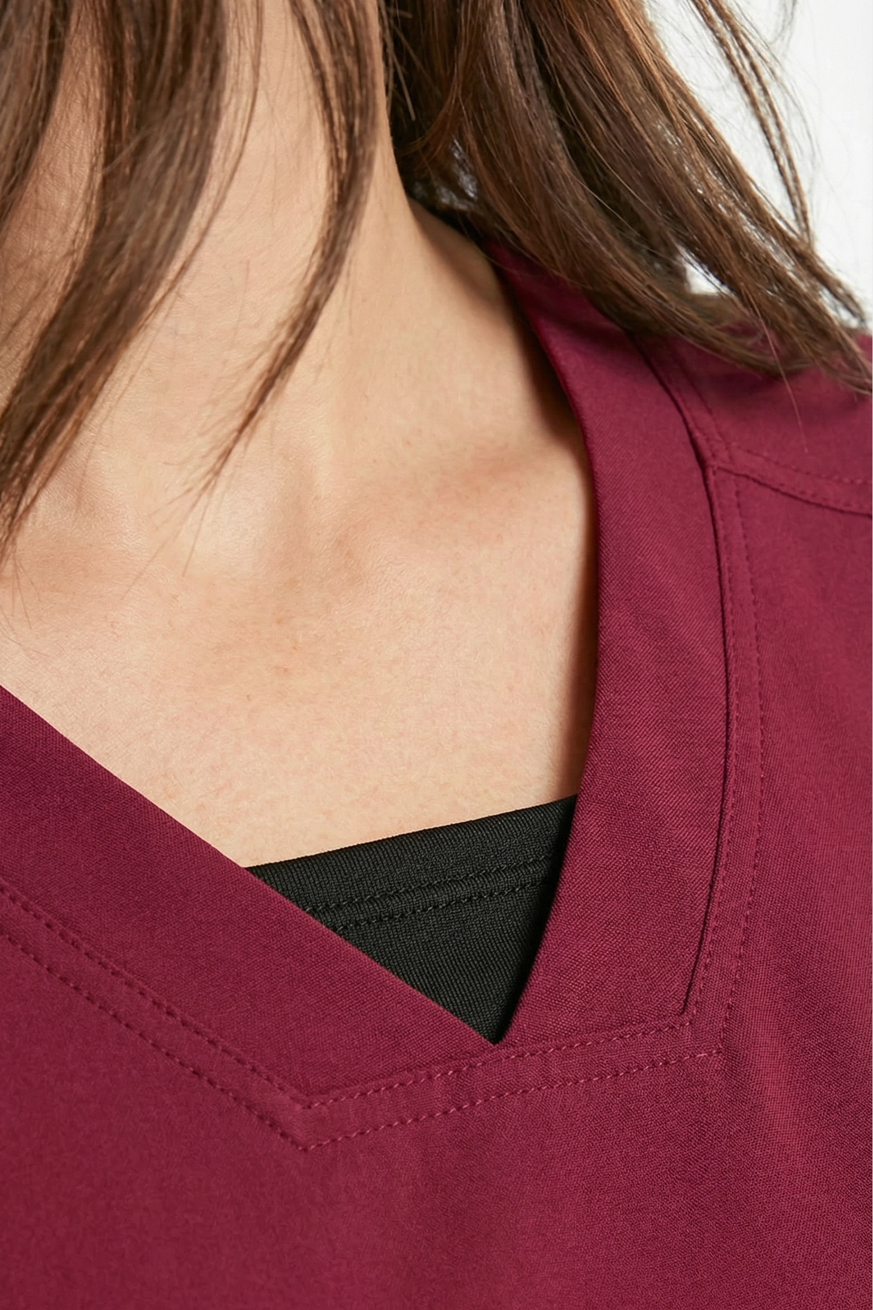 - Cuello en “V” y costuras limpias